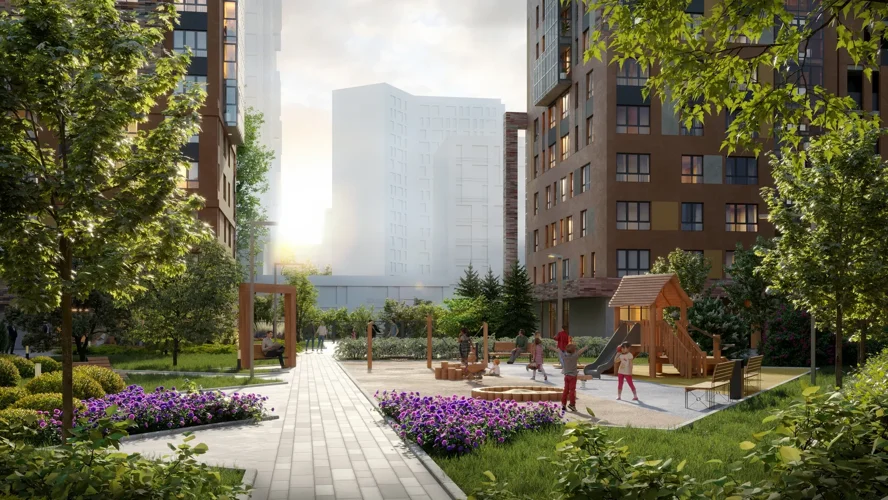 Мы следуем концепции «закрытый двор» - территория двора полностью огорожена от посторонних забором, а автомобили паркуются по внешнему периметру здания.