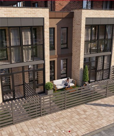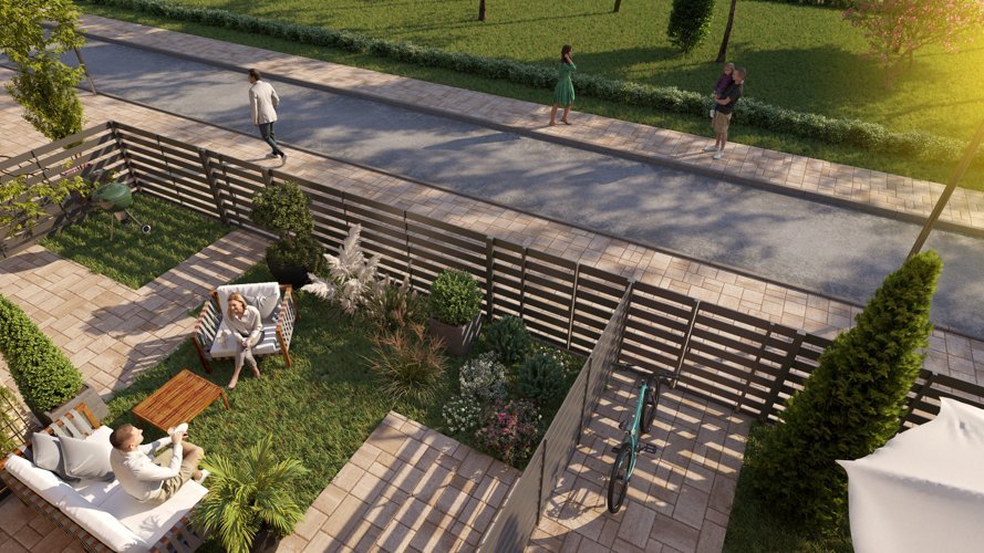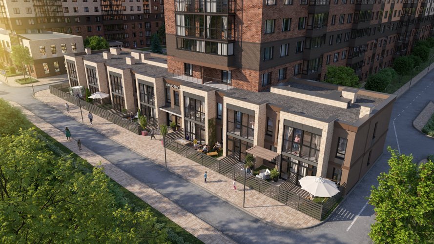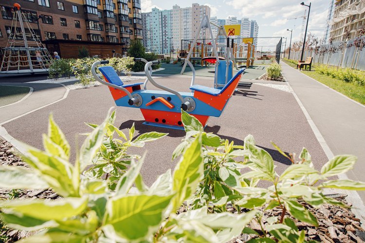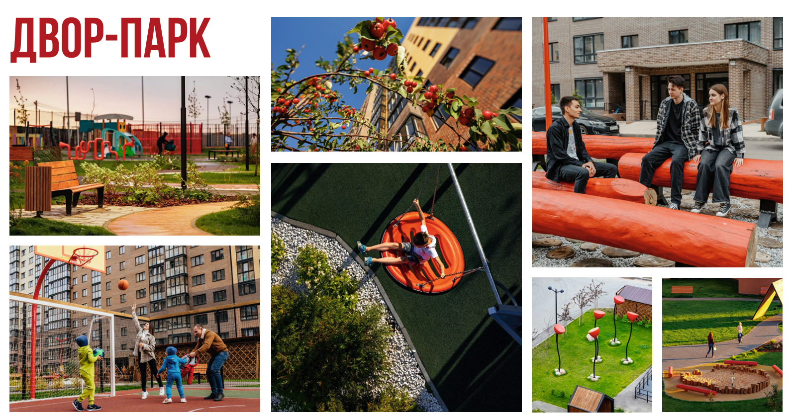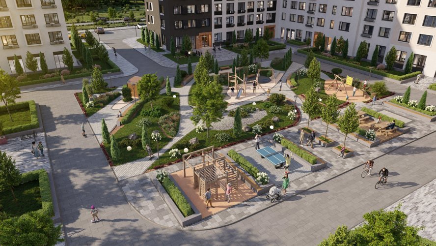 Дворовая территория выполнена в концепции двор-парк, где более 50% пространства занимает многоуровневое озеленение. По сравнению с обычным, оно даёт ощущение объёма и изобилия, формирует комфортную экологичную среду с заботой о здоровье жителей.