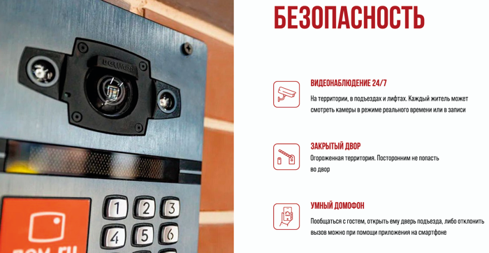 На территории квартала, в подъездах и лифтах установлено круглосуточное видеонаблюдение. Каждый житель может смотреть камеры в режиме реального времени или в записи. Территория ЖК огорожена забором, установлены входные калитки и автоматические ворота.