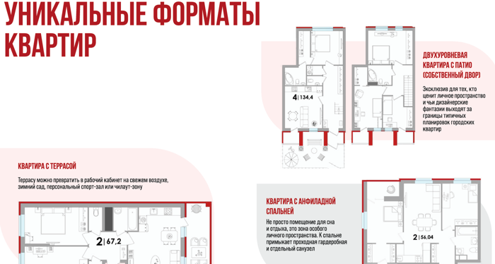 В жилом квартале «Южный» есть квартиры для всех сценариев жизни: от первой до семейной. Уникальные форматы планировок: смарт-квартиры с просторной кухней-гостиной, квартиры с мастер-спальней, квартиры с гардеробными, двухуровневые квартиры с патио.